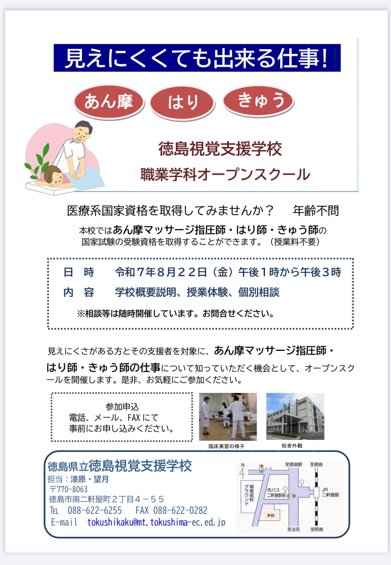 今後、本校では、企業などの職場内で従業員の福利厚生を目的に施術を行う「ヘルスキーパー」と呼ばれるあん摩・マッサージの就業スタイルを、県内各地の多くの皆さんに知っていただけるよう啓発活動に取り組んでいく予定です。私たちの徳島視覚支援学校あん摩・マッサージ体験、次は皆さんのお仕事場に伺うかも知れません。生徒・職員一丸となって頑張りますので、そのときはどうぞよろしくお願いいたします。